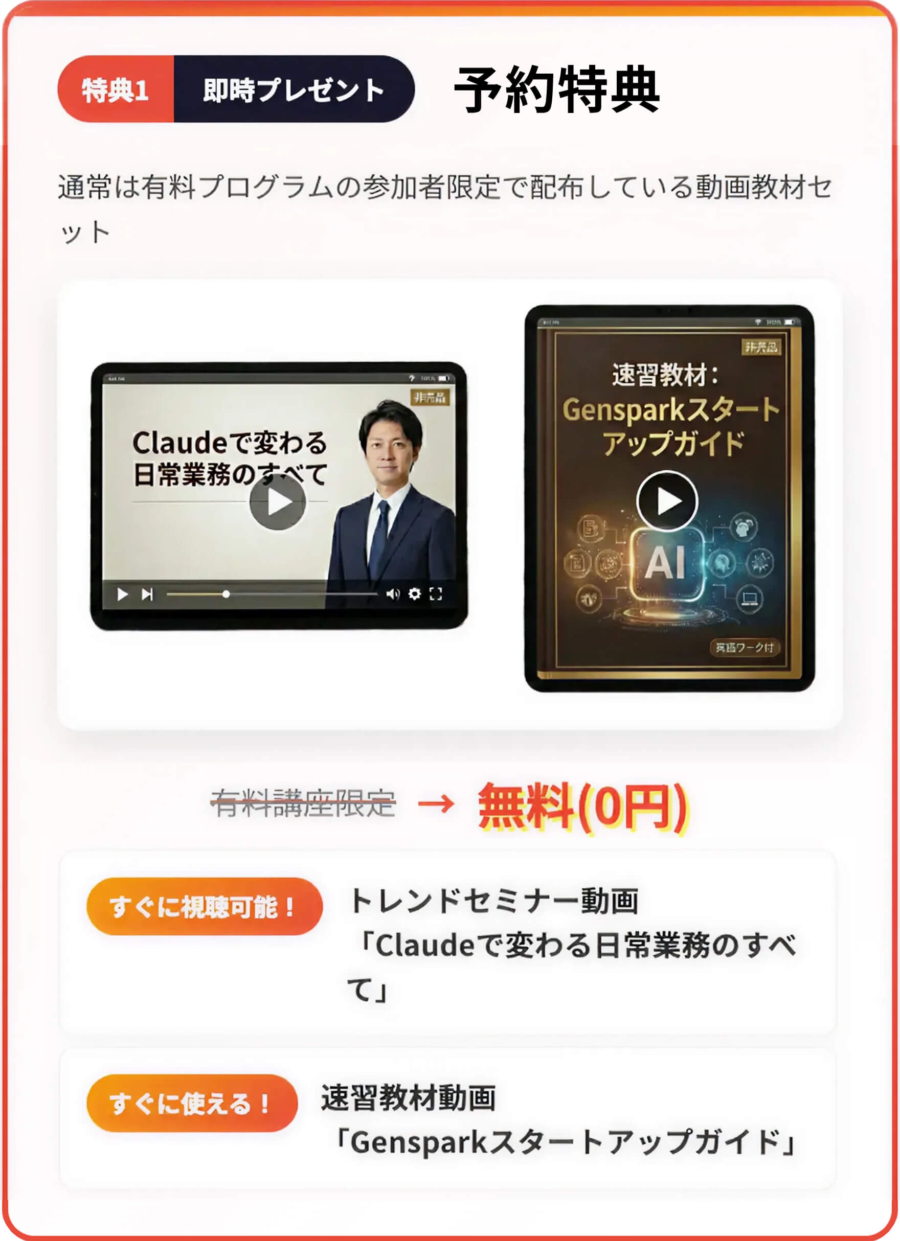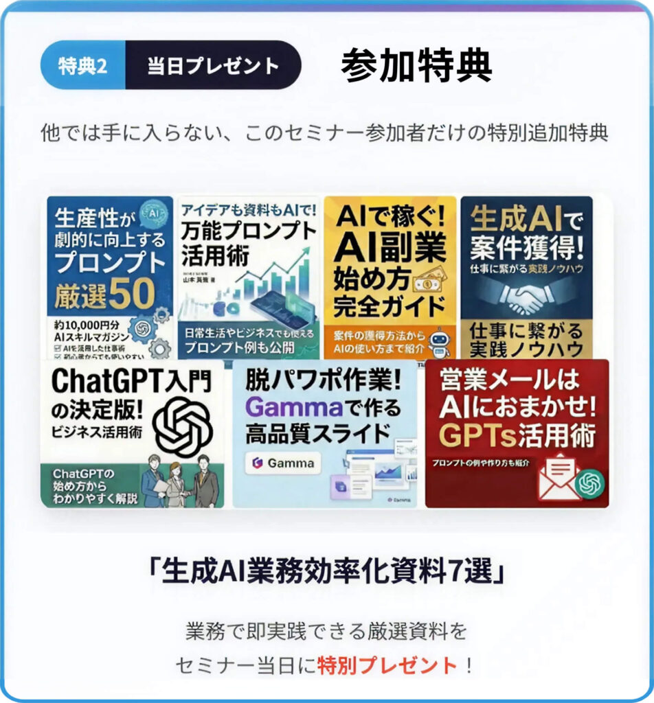 加えて参加者には限定特典が用意されており、生成AIで業務効率化を行うときのノウハウをまとめた教材がプレゼントされます。セミナー内容と合わせて学ぶことで、実践で活かせるスキルが身につくのです。